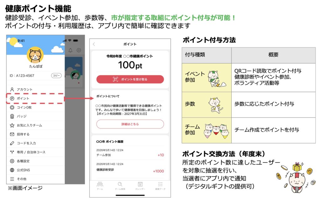 - できます。ポイント付与の方法は、日々の歩数に応じた付与、イベント参加に応じた付与(二次元バーコードの読み取りによる付与)、チーム参加による付与の3通りです。自治体様の指定する取組へのポイント付与を自由に設計いただけます。